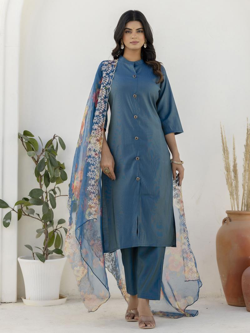 | Fabric : | Kurta Fabric: Shimmer Silk fabric Bottom Wear Fabric: Shimmer Silk fabric Dupatta Fabric: Organza with embroidery dupatta Dupatta Length: 2.10 meter Bottom Length: 37 Inches Top Length: 45-inch Approx Sleeve Length: Three-Quarter Sleeves Product Information: Set Type: Kurta With Bottom Wear & Dupatta Kurta Type: Straight Bottom Type: Pant Pattern: Button Type Multipack: 1 Kurta, 1 Pant, 1 Dupatta Fit Type: Tailored for elegance and ease |