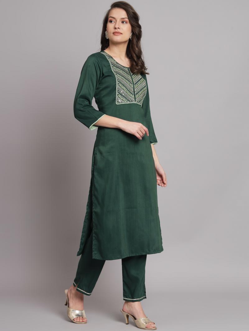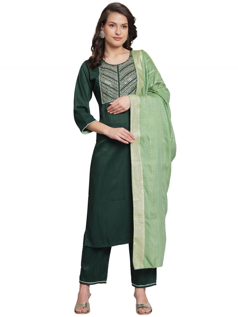 | Fabric : | Elevate your ethnic wardrobe with this elegant emerald green kurta set, designed to blend timeless tradition with modern sophistication. The kurta features intricate embroidery on the yoke, adding a refined festive charm, while the solid-toned bottom ensures a balanced and graceful look. Paired with a beautifully coordinated dupatta accented with subtle woven stripes and a delicate border, this ensemble is perfect for celebrations and special occasions. Fabric: Silk Blend (Kurta & Bottom) Soft Silk Blend Dupatta Color: Deep Emerald Green with Light Green Dupatta Kurta Details: Straight-cut kurta Round neckline with detailed embroidery Three-quarter sleeves Calf-length silhouette Bottom Details: Straight-fit pants Comfortable elasticated waistband Ankle-length Dupatta Details: Light green contrasting dupatta Subtle woven stripes with elegant border Soft, lightweight drape |