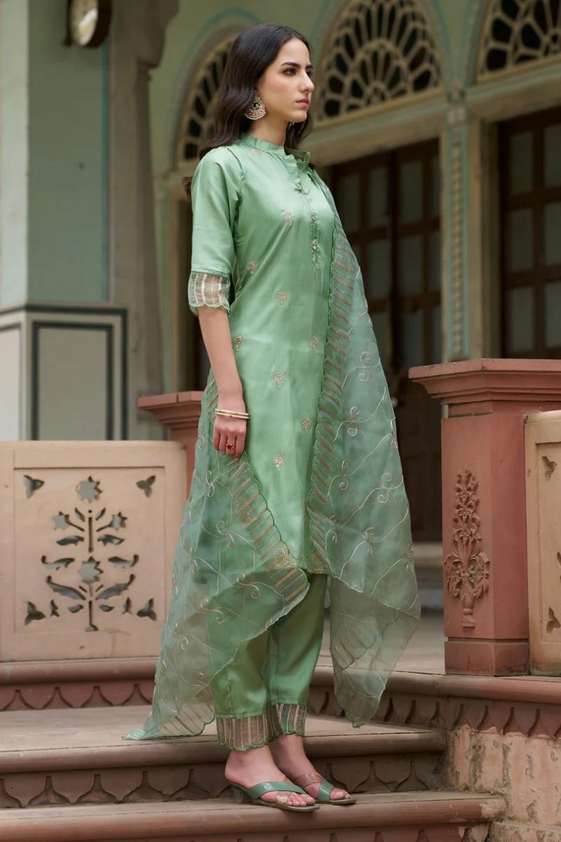 | Fabric : | Kurta Fabric: Silk Blend Bottom Wear Fabric: Silk Blend Dupatta Fabric: Silk Embroidery Dupatta 2.2mtr Neck: Collared Neck Sleeve Length: Three-Quarter Sleeves Top Length: 44 to 45 inch Approx., Sleeve Length: 17inch, Bottom Length: 37inch, Dupatta Length: 2.20mtr Approx. Set Type: Kurta With Bottom Wear & Dupatta Bottom Type: Pants Pattern: Embroidered Multipack: 1 Kurta, 1 Pant, 1 Dupatta |