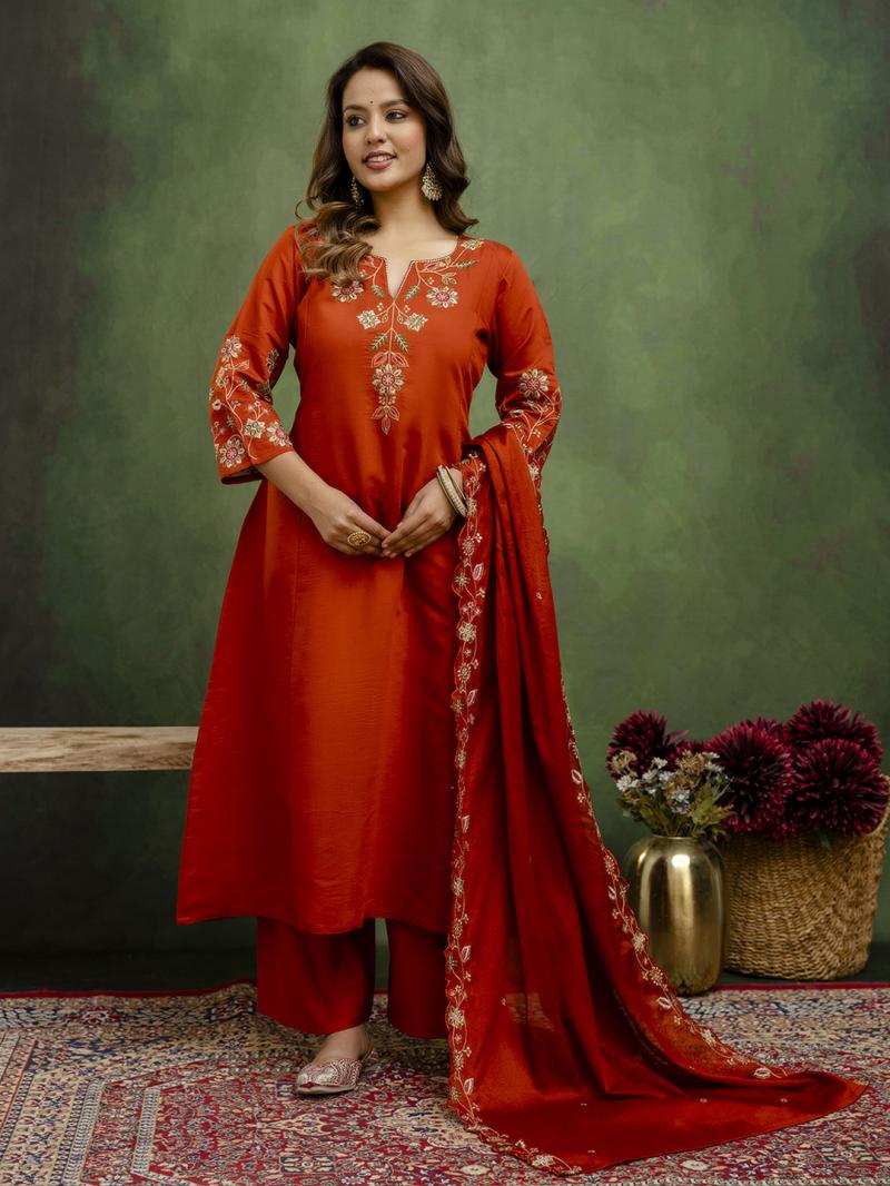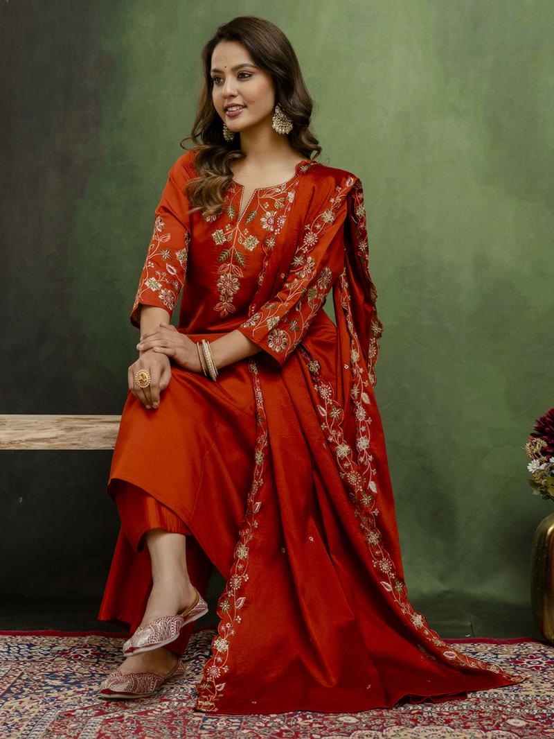| Fabric : | Kurta Fabric: Silk Blend Bottom Wear Fabric: Silk Blend Dupatta Fabric: Silk Blend Dupatta With Embroidery Dupatta Length: 2.10 meter Bottom Length: 37 Inches Top Length: 45-inch Approx. Sleeve Length: Three-Quarter Sleeves Product Information: Set Type: Kurta With Bottom Wear & Dupatta Kurta Type: Anarkali Bottom Type: Pant Pattern: Embroidered Neck Type: Fancy Neck Fabric care: Dry Clean Only Multipack: 1 Kurta, 1 Pant, 1 Dupatta Country of Origin: India |
