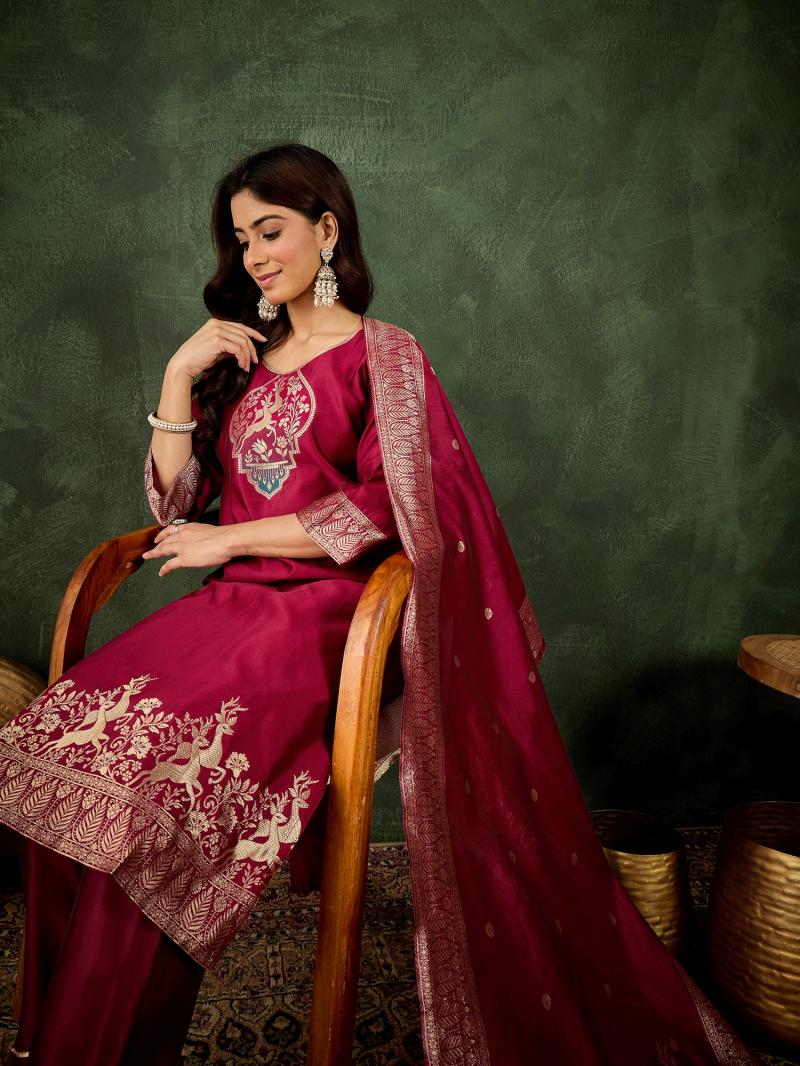 Buy VP 9737 C Silk Blend Banarasi Jacquard Zari Woven Straight Kurta Pant with Dupatta Set full catalog online from Textilecatalog at wholesale price.