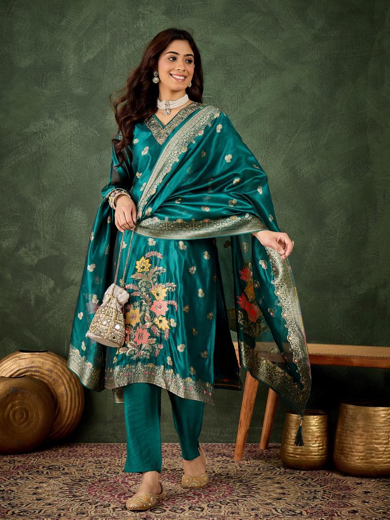 Buy VP 9738 R Embroidered Silk Blend Organza Meenakari Straight Suits With Dupatta full catalog online from Textilecatalog at wholesale price.