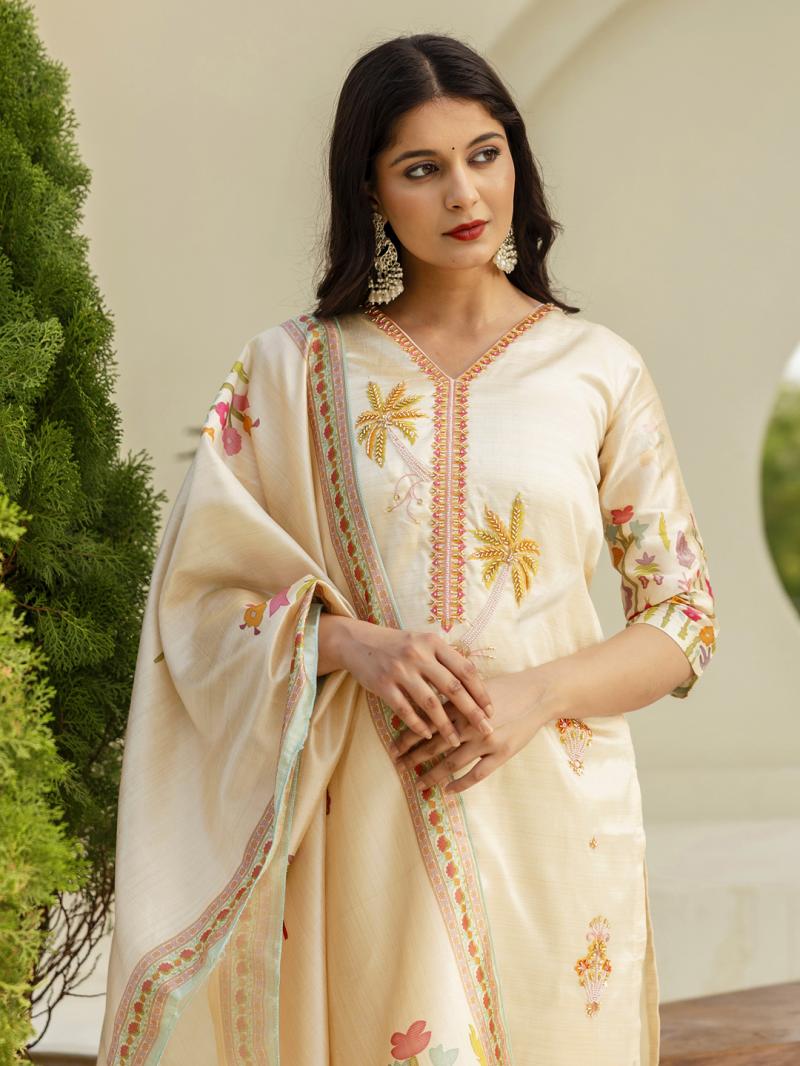 | NAME: | VP 9739 C Cream Floral Print Silk Women Kurta Sets With Printed Dupatta Suits |