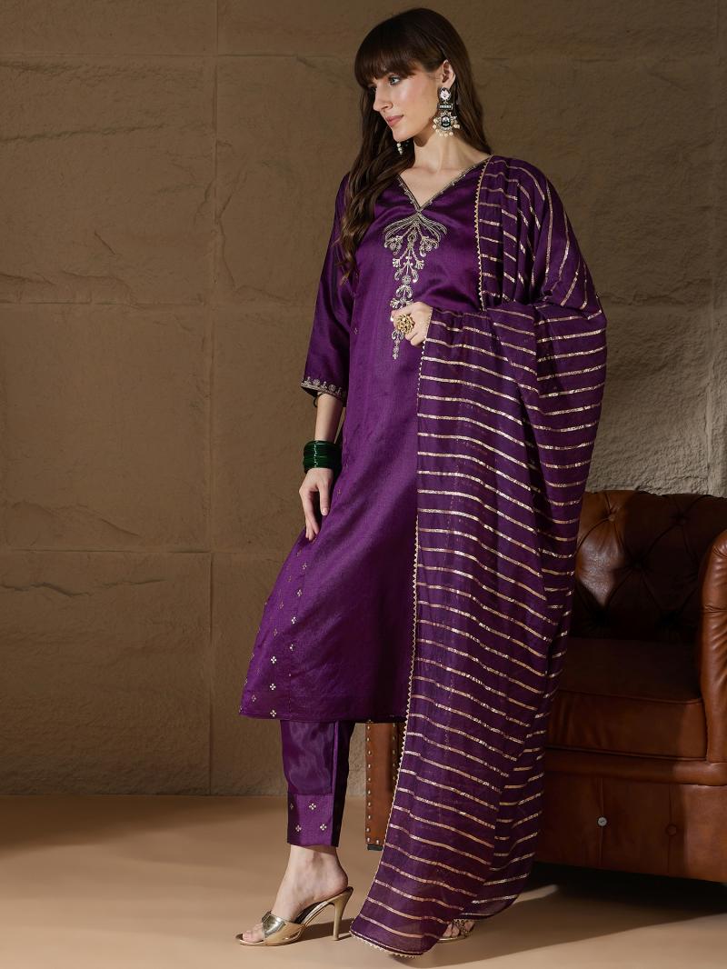 | Fabric : | Color: Deep Royal Plum / Wine Purple Fabric: Silk Blend (soft sheen with a rich, festive fall) Kurta: Straight-fit kurta with elegant silhouette Intricate zari embroidery on the neckline and yoke Subtle butti motifs scattered across the body V-neck design with refined handcrafted detailing Full sleeves for a classic, graceful look Bottom: Matching straight pants Coordinated butti work for a cohesive finish Comfortable fit suitable for long wear Dupatta: Coordinated plum dupatta Gold zari stripe detailing throughout Finished with a delicate border that enhances festive appeal Occasion: Ideal for festive gatherings, weddings, family functions, and evening celebrations |
