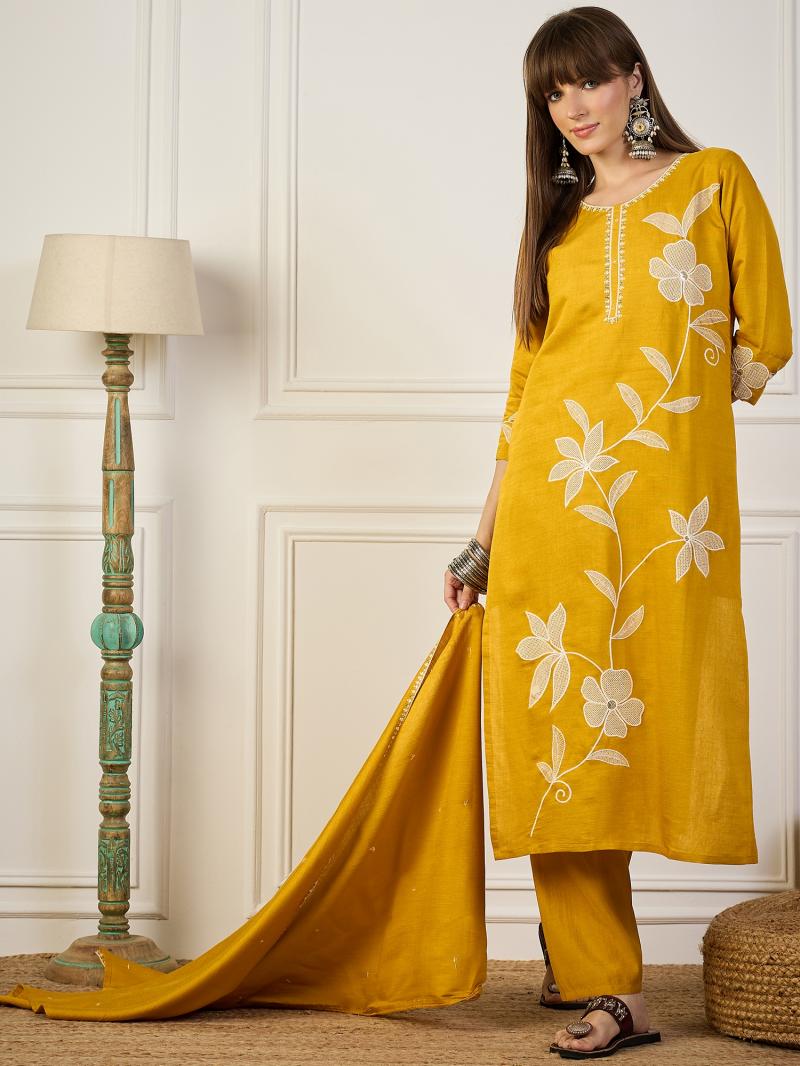 | NAME: | VP 9771 Y Yellow Embroidery Silk Straight Kurta With Trousers & Dupatta Sets |