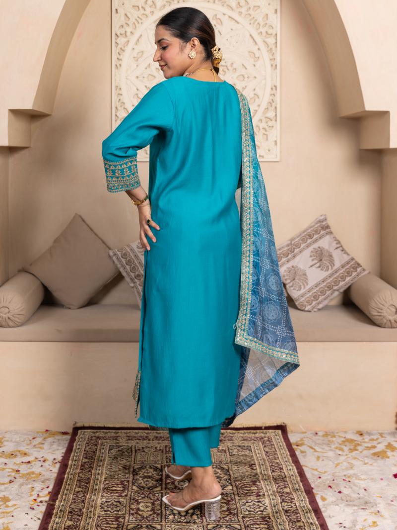 | Fabric : | Kurta Fabric: Silk Blend Bottom Wear Fabric: Silk Blend Dupatta Fabric: Organza Dupatta with Embroidery Dupatta Length: 2.10 meter Bottom Length: 37 Inches Top Length: 45-inch Approx. Sleeve Length: Three-Quarter Sleeves Product Information: Set Type: Kurta With Bottom Wear & Dupatta Kurta Type: Straight Bottom Type: Pant Neck Type: V Neck Pattern: Beads Embroidered Multipack: 1 Kurta, 1 Pant, 1 Dupatta Fabric care: Dry Clean Only |